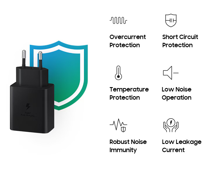 محول الشحن الأصلي من سامسونج بقدرة 45 واط يمنحك شحناً سريعاً وآمناً لهواتف سامسونج المتوافقة مع Super Fast Charging 2.0.