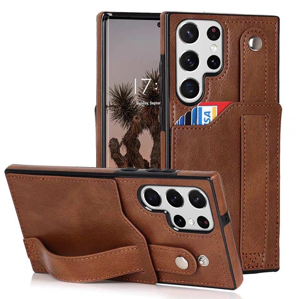 غلاف جلدي أنيق يوفر حماية قوية للهاتف مع حامل بطاقات مدمج لوضع بطاقتك المصرفية بسهولة، بالإضافة إلى حزام خلفي لمسكة مريحة وآمنة.
